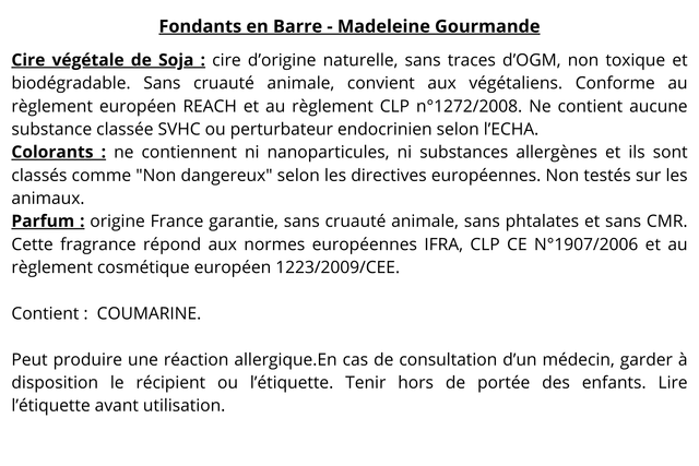 Coulé à la main, chaque fondant est un modèle unique. Les photos sont donc non contractuelles. Les fondants peuvent présenter des variations de couleurs et des imperfections liées à la nature végétale de la cire peuvent apparaître.